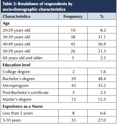 The median age of participants was 44 years, with an interquartile range of 35 to 54 years. Sixty-eight percent (N=83) were aged 30 to 49, reflecting a young family life stage (Table 2). Sixty-six percent (N=81) had less than five years of IPC experience, while 30% (N=36), had over 20 years in nursing. Among those with more than five years in IPC, only 56% (N=23/41) held formal IPC training, such as Certification in IPC (CIC), a post-bachelor’s certification in IPC (Microprogram-IPC) or a graduate training in IPC (Diplôme d’études supérieures spécialisées IPC (DESS-IPC)).